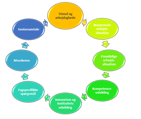 Medarbejdere, som er 5 år fra den officielle pensionsalder, vil få tilbud om en seniorsamtale efterfølgende eller eventuelt i forbindelse med MUS.