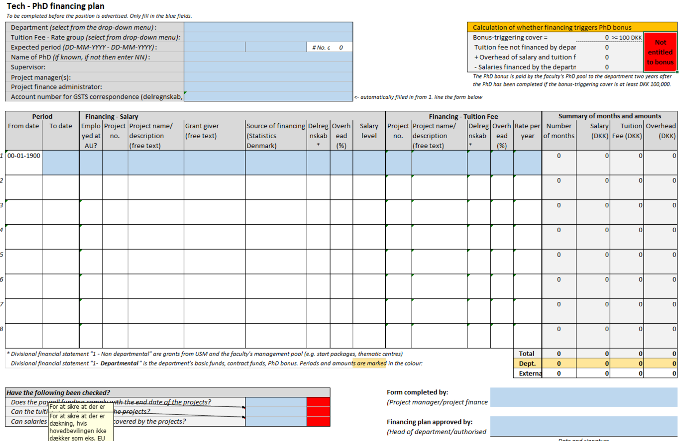Vi skal dog stadig sikre, at en komplet finansieringsplan er på plads inden optagelsen af den ph.d.-studerende og derfor skal vedhæftede finansieringsplan fremover anvendes. Finansieringsplanen kan også findes på Økonomis hjemmeside: Ph.d. finansieringsplan (TECH) (au.dk)