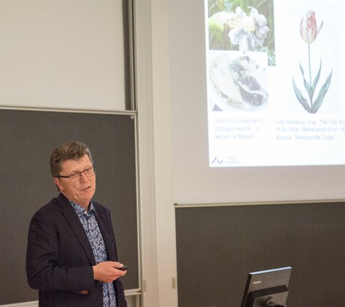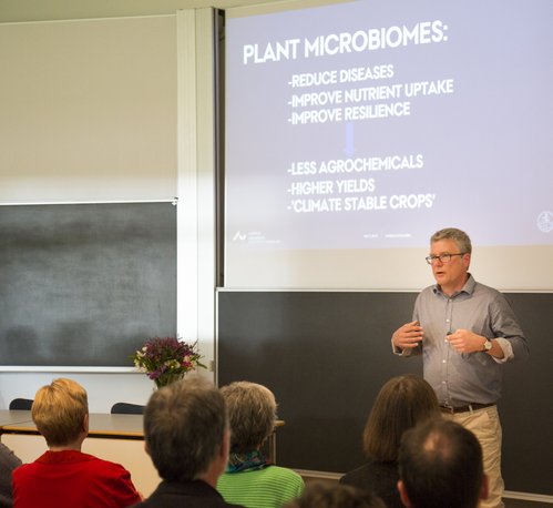 - På grund af stigningen i verdens befolkningstal er det bydende nødvendigt med innovative og bæredygtige men samtidig produktive metoder til planteproduktion. Udnyttelse af potentialet i jordens særdeles forskelligartede mikrobiom er en lovende strategi til at øge optagelsen af næringsstoffer og øge afgrødernes modstandsdygtighed over for sygdomme, fortalte Mogens Nicolaisen. I sin forelæsning gav han eksempler på sine og kollegaernes studier af mikrobiomer i tilknytning til planter og deres virkninger på afgrøder.