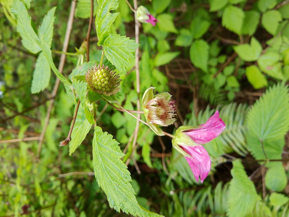 Fast-forward 3 months and the initial shock has thawed, settling into a new state of normal. Now, I head out to the backyard every morning with my binoculars and phone to record bird sightings. The Dark-eyed juncos, starlings, towhees, hummingbirds, and robins have become familiar faces. With each sighting, I feel as if I am greeting a friend. Douglas and gray squirrels merrily scamper about. Their brief visits provide some welcome entertainment and joy. Each day I take a walk in the woods near our home. The culmination of these repeated outings has allowed me to witness the progression of growth of salmon berries, starting from a green bud, then to magenta flower and culminating in a bright red-orange berry. To my delight today, they were ripe for the picking and I savored my first one of the season.