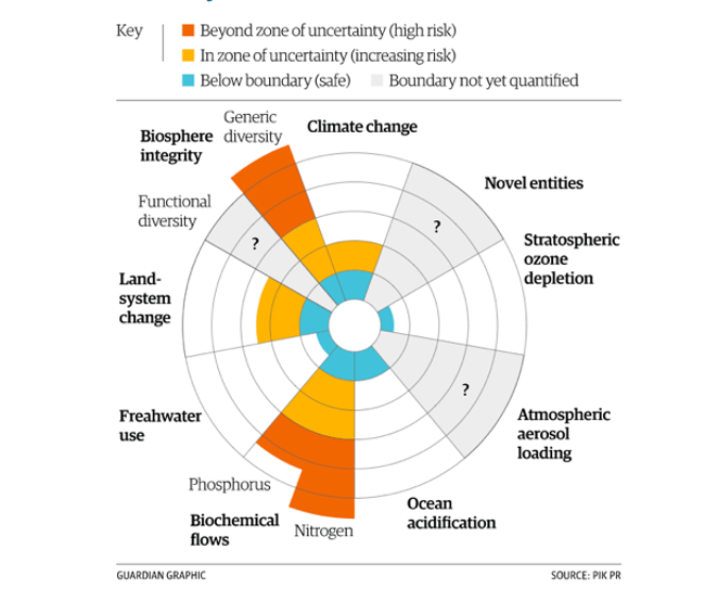 Figure 1. Shows the 9 planetary boundaries, the colors indicate whether we are inside or outside the different planetary boundaries - Rockström J, et al. (2009): A Safe Operating Space for Humanity. Nature's Journal