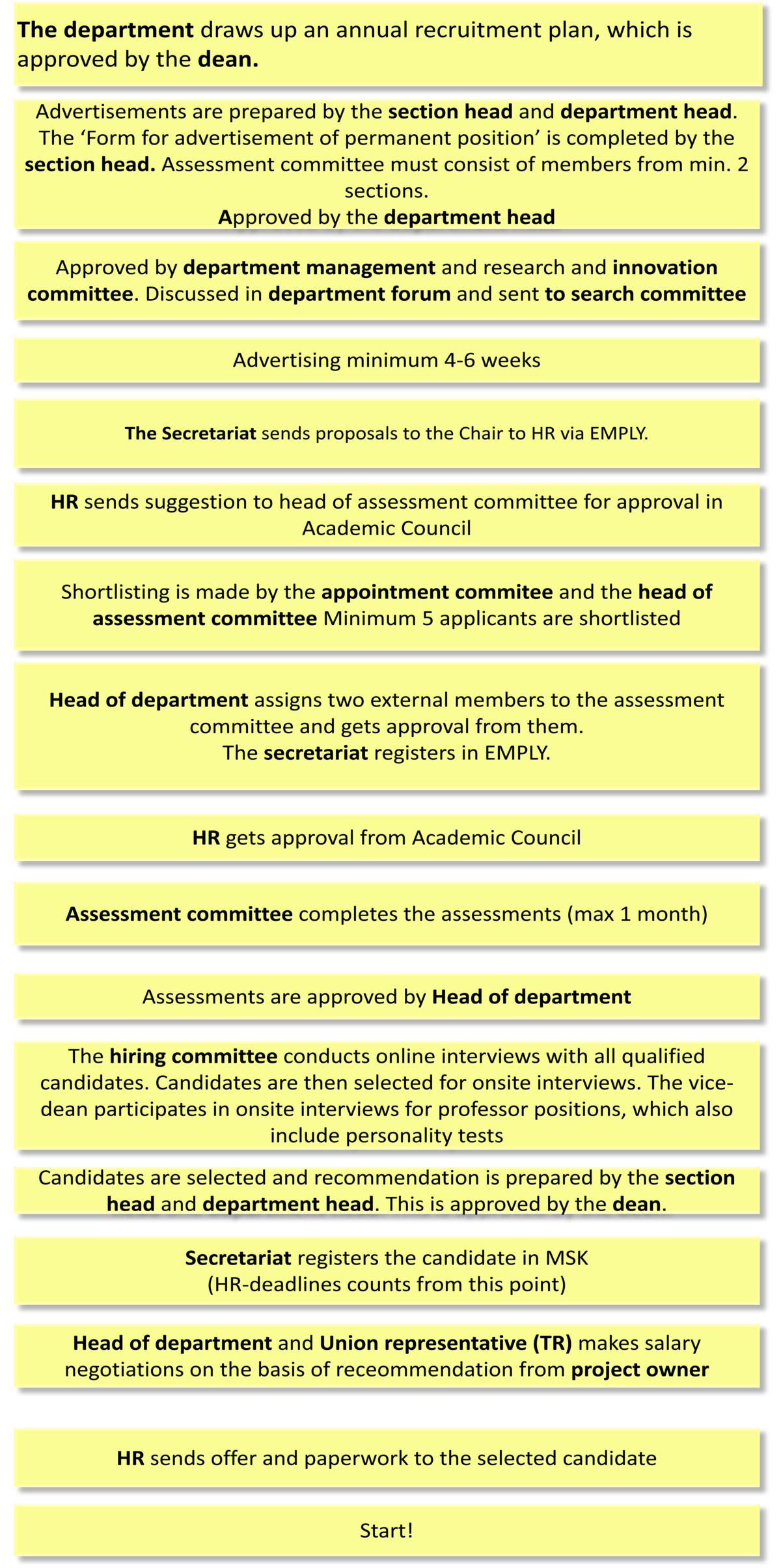 Hiring of permanent VIP is taking place in accordance with the departmens recruitment plan. This plan is updated every year and must be approved by the dean. The process follows the flow diagram at the right.