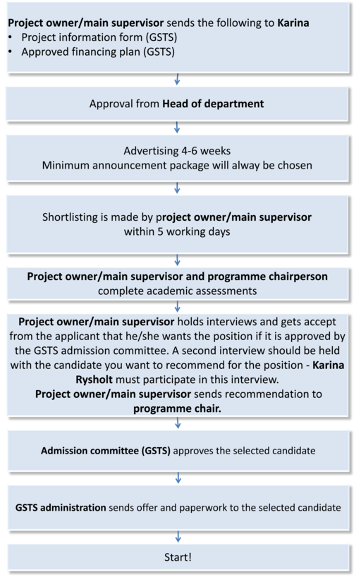 GSTS requires the participation of the PhD committee at interviews. In AGRO, it has been decided that Karina Rysholt will participate in the second interview with the candidate you want to hire. This is to ensure that formalities (including language requirements) in relation to enrollment are observed.