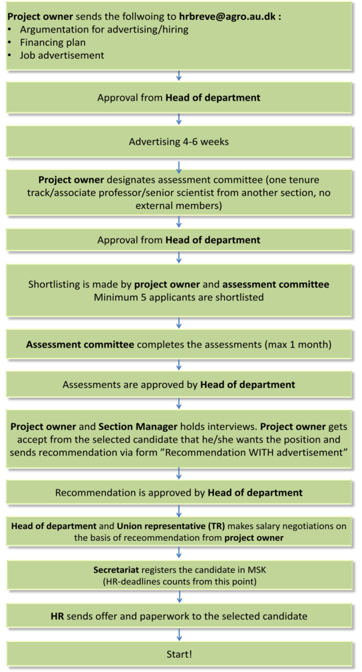 In special cases, employment can take place immediately after the submission of the dissertation, if the person in question is employed in an advertised position for at least 2 years. Advertisements and hiring are made in accordance with the applicable HR rules as shown in the flow diagram.
