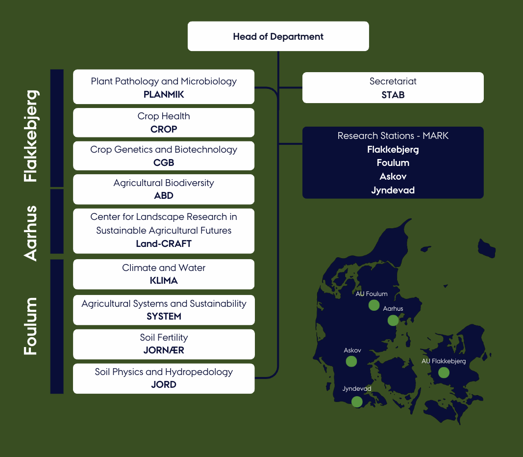 MARK består af 3 driftsenheder i Foulum, Askov og Flakkebjerg, som udfører praktiske forsøg på instituttets unikke forskningsfaciliteter, herunder forsøgsstationer og semifieldanlæg med forskellige jordtyper og klima.